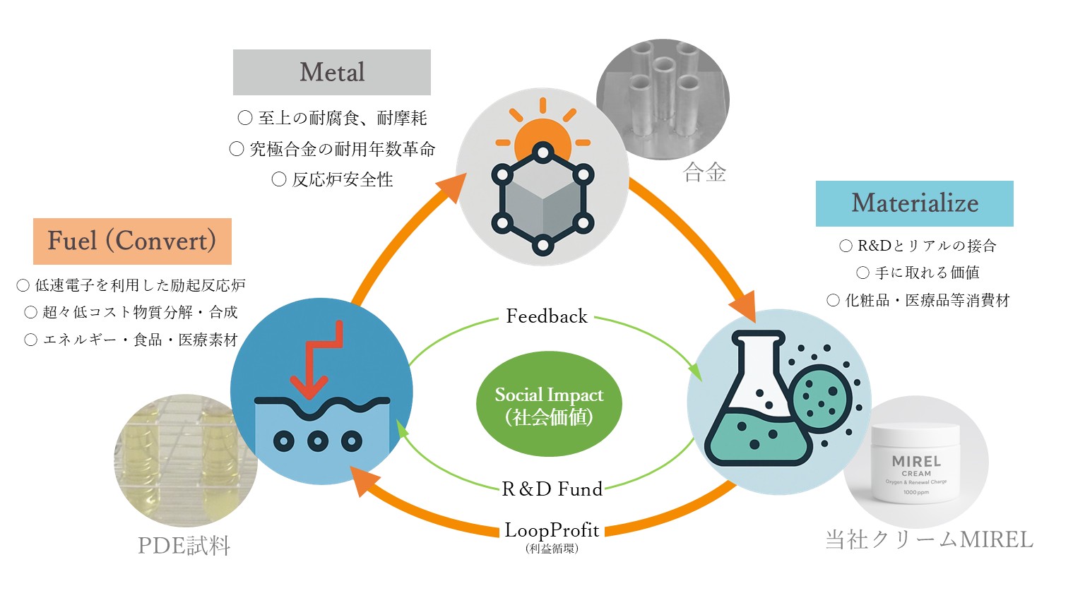 低速電子界面励起反応(PDE反応)でつくる “やさしいプラズマ” が物質表面で電子的に反応を促進する技術)による糖化処理技術。低コストで物質の分解と合成が可能となる技術です。これを未利用バイオマスの分解からエネルギーのみならず、この反応の安全性から、医療・食品展開に産業化いたします。